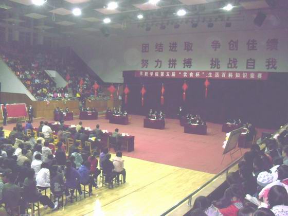 本网讯(通讯员 余斌)12月7日晚,由学工部主办,院学生会承办的第五届“饮食杯”大学生百科知识竞赛在综合馆隆重举行,由11个系部33位选手参加本次竞赛。学工部匡予生书记、饮食公司张广雷经理及1800名同学参加了本次活动。