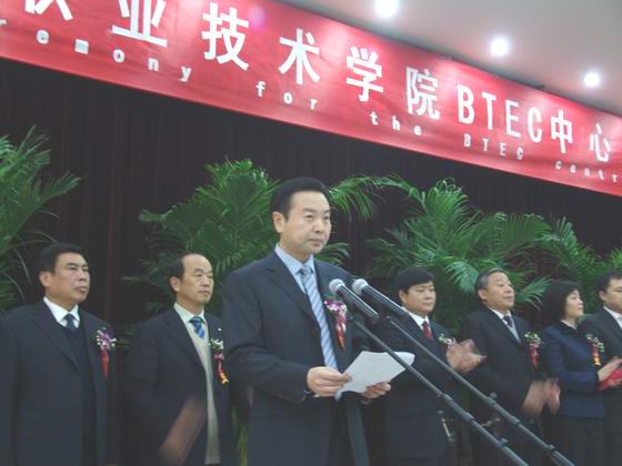 揭牌仪式上,王丽代表市委、市政府致辞。她说,平职学院在35年的办学实践中走出了一条切实可行、企业社会认可的高职教育办学之路。学院BTEC中心的成立,标志着学院对外合作办学水平迈上了一个新的台阶,对提升学院办学水平、进一步加强对外交流合作起到积极的促进作用。希望平职学院以此为新的起点,承前启后、继往开来、开拓创新、不断探索,努力开创学院改革发展新局面,为全市经济社会发展作出更大贡献。希望英方代表及各位来宾一如既往地关心支持学院合作办学项目,与我市开展更广泛的交流合作。平顶山市委、市政府将努力为合作办学项目提供良好优质服务。