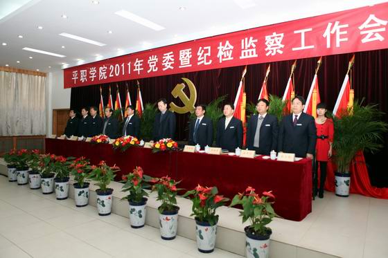 本网讯(裴朝阳)3月13日上午,我院隆重召开2011年党委工作会议暨纪检监察工作会议。学院党政领导蔡志刚、任文杰、郑运廷、李幸福、李江明、李树伟、王任远、徐国强、方万钧、张立新等出席会议并在主席台就坐。会议由院长任文杰主持。院工会主席张立方外出请假。学院全体党员、科级以上干部和入党积极分子参加会议。