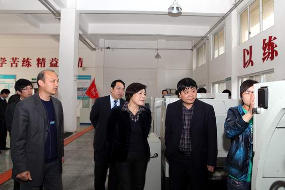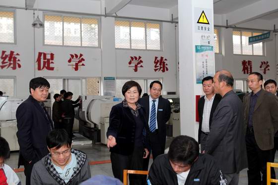 刘站长来到新实训楼数控车间,看到一排排整齐的数控车床旁,学生们在老师的指导下有序、紧张地进行机件加工。她一边询问指导老师“这是哪个专业的?几年级的学生?一周几节这样的课?”一边指着围坐在实训桌旁正在进行理论设计的同学说:“这就是职业教育,一边是课堂,一边是操作。这样好、这样好。”