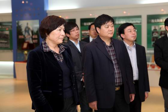 刘先琴(左一)在院党委书记蔡志刚陪同下参观校史展览室