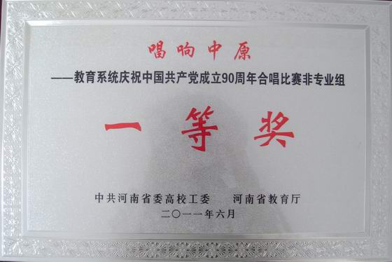 为庆祝中国共产党成立90周年,中共河南省委高校工委、河南省教育厅举办了本次大赛。我院金果合唱团经过三个月的的刻苦训练,从参赛的全省高校52支代表队中脱颖而出,并最终进入决赛,并取得大赛非专业组一等奖的好成绩。