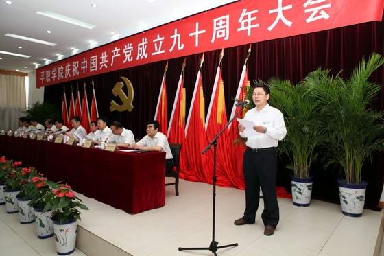 本网讯(裴朝阳)今天上午九时,1号教学楼7楼会议室气氛热烈欢快。在庄严的国歌声中,平顶山工业职业技术学院庆祝建党90周年大会暨创先争优表彰大会在这里隆重召开。学院党政领导蔡志刚、任文杰、郑运廷、李幸福、李江明、李树伟、王任远、张立方、徐国强、方万钧、张立新出席大会。全体共产党员和入党积极分子代表参加了会议。