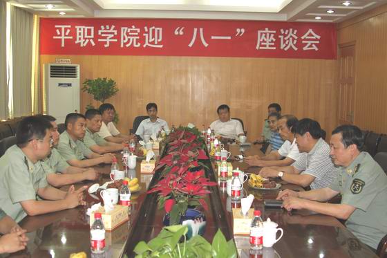 本网讯(高英民)7月26日,学院邀请平顶山市武警支队副队长廖生堂、集团公司武装部副部长王平山以及湛河区武装部、平顶山武警教导队、九里山武装部的负责同志,在办公楼三楼会议室举行迎“八一”座谈会,共叙军民鱼水情,庆祝中国人民解放军建军84周年。