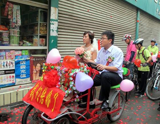 9月17日早上6点半,新郎李恩泽老师带领单车迎亲队从市区凌云路北端出发,到矿工路中段迎娶新娘。8点钟,新娘和新郎登上一辆双人自行车,32名迎亲单车队伍分两列在后,驶向新郎家。途中引来不少市民驻足观看,一位女士连连称赞说;“这种婚礼方式真时尚,既环保又有意义!真好!”