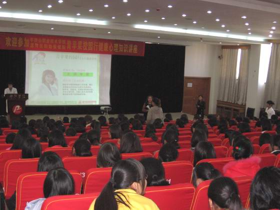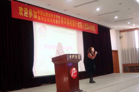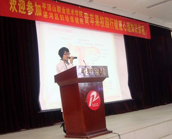本网讯(寇晓杰)10月14日下午,心理咨询中心在2号教学楼701教室举办了青苹果校园行健康心理知识讲座,讲座由我院“青苹果校园行”活动健康教育特聘专家湛河区妇幼保健院段红伟医师,资深情感咨询师市电台玫瑰女人栏目主持人于慧老师主讲,学院800余名女生参加了讲座。