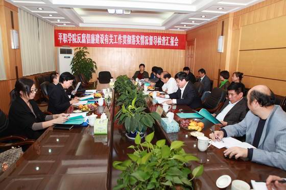 在三楼会议室,检查组领导听取了我院党委书记蔡志刚关于“三重一大”、“校务公开”和“查找廉政风险、构筑拒腐防线”等活动的贯彻落实情况,查阅了相关档案资料,并与有关部门负责人进行了座谈。检查组对我院结合企业高校实际,筑牢反腐倡廉保障体系,深入开展反腐倡廉工作,实现快速发展给予了充分肯定。