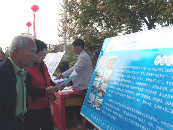 10月25日,我院在新城区市行政审批服务中心一楼会议室参加了2011年河南省暨平顶山市全民终身学习活动周开幕式。在鹰城广场参加了平顶山市全民终身学习成果展。我院制作的宣传展板,全面展示了学院学习型校园建设成果,受到了参观领导和市民的关注。由院团委派出的四名解说服务人员,也以声情并茂的讲解受到市民交口称赞。