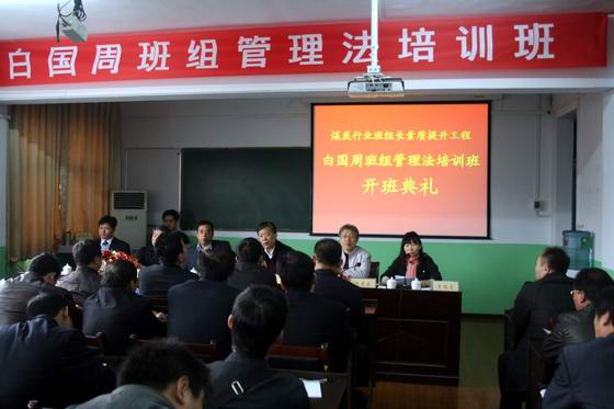 本网讯(王春莹 姜波)根据《煤炭行业班组长素质提升工程(“乌金蓝领工程”)实施意见》(中煤协会人事【2011】139号)文件安排,第一期白国周班组管理法培训班于11月8日在我院工贸校区正式开班。中煤协会培训中心副主任何树国、总培训师倪光宗、副总培训师王艳霞、中国矿业大学周心权教授、平职学院李江明副院长、全国劳模白国周以及来自全国各地138名学员班组长参加了开班典礼。