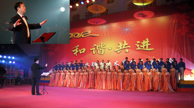 “西边的太阳就要落山了,微山湖上静悄悄,弹起我心爱的土琵琶,唱起那动人的歌谣。”学院领导和学生一起演唱的合唱《弹起我心爱的土琵琶》,充满激情,极具感染力,晚会至此达到高潮。合唱指挥由院长任文杰担任。