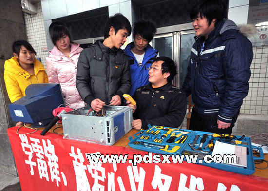 张志伟同学从走进平职学院计算机系那天起,学校就为他成立了帮扶小组,至今仍在悉心照顾他的生活。张志伟用感恩回报传递师生爱心,3月3日,在该院举行的“学雷锋,献爱心”活动中,2009级计算机专业残疾学生张志伟(右二)携带工具来到现场,为师生义务维修电脑。本报记者王尧摄
