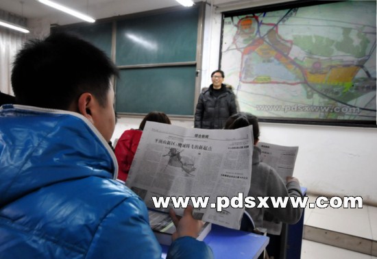 2月23日,平顶山工业职业技术学院测量专业师生在课堂上讨论《平顶山日报》的报道《平顶山新区:鹰城腾飞的新起点》。本报记者王尧摄