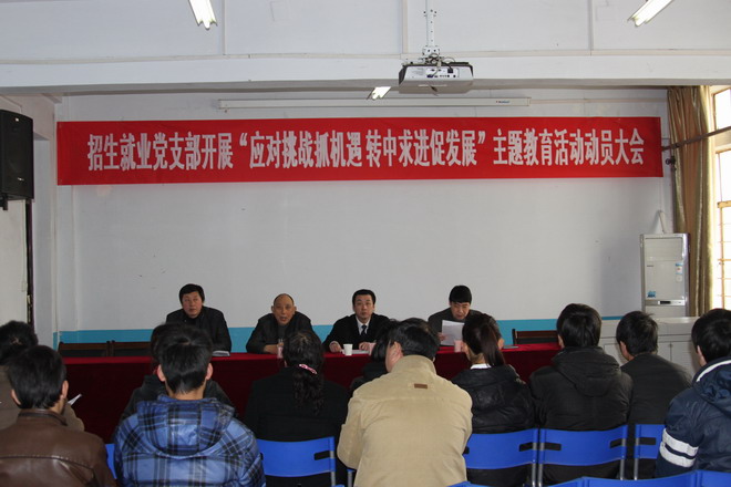 会上,招生处处长沈智勇传达了学院党委《关于深入开展“应对挑战抓机遇,转中求进促发展”主题教育活动的通知》文件精神;就业处处长梅胜利宣读了招生就业党支部《开展“应对挑战抓机遇,转中求进促发展”主题教育活动方案》;党支部书记肖德军对本次活动提出了要求。要求招生就业党支部全体党员、干部、职工,统一思想,坚定信心,积极抢抓机遇,迎接面临的新挑战,加快实现学院内涵发展方式的转变,全面完成学院党委年度工作会议和三届一次教代会确立的工作目标,实现招生、就业工作新发展。(智红华)