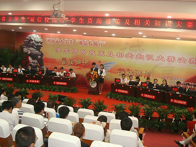5月18日,由河南省学生资助管理中心主办、新乡医学院承办的河南省“诚信校园行”学生资助政策及相关知识大赛总决赛,在新乡医学院大礼堂隆重举行。36所本、专科高校参加了比赛,我院由叶俊峰、晏卫红、周家玲、张艳培组成的代表队,摘得铜牌。(学工部)