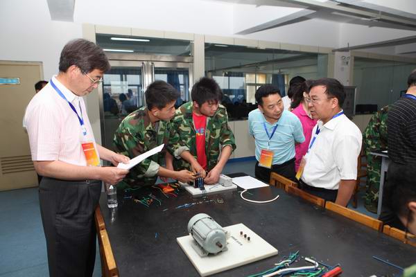 各位专家在文化路,参观了正在举办的人才培养成就展。在新实训大楼,先后查看了数控车间、富士康机器人实训室、自动化控制实训室、服装设计与工艺产线等。并不时地向正在上课老师和学生询问有关情况。