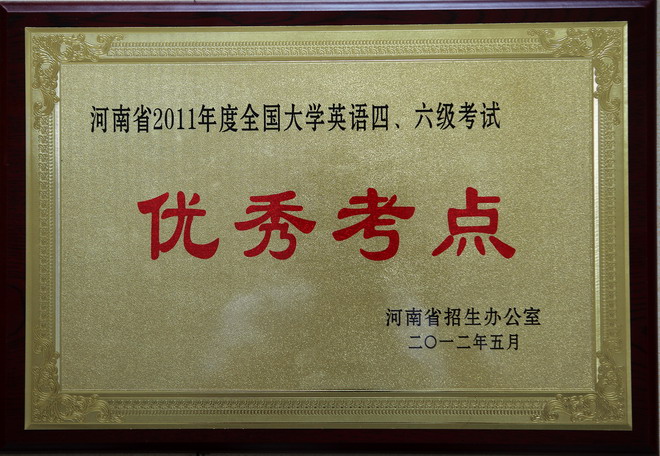 5月31日,在省教育厅组织的2012年上半年全国大学英语四、六级(CET)考务工作会议上,省招生办公室对全河南省高等院校103个考点进行了综合考评情况通报,我院为获国家英语四、六级考试省“优秀考点”称号的六所院校之一,得到大会表彰。