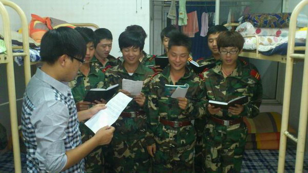 9月3日晚,由艺术系团总支选派的“教校歌小分队”的同学们,利用新生军训休息时间向新同学教唱校歌。
