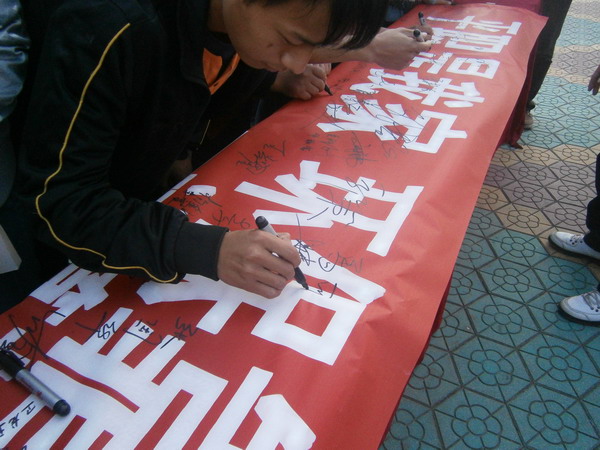 10月17日,计算机系在学院升旗广场成功举行了大型横幅签名活动。活动以“平职是我家,环保靠大家”为主题,目的在于号召更多的学生加入到美化校园、提高自身环保意识的活动行列当中去。