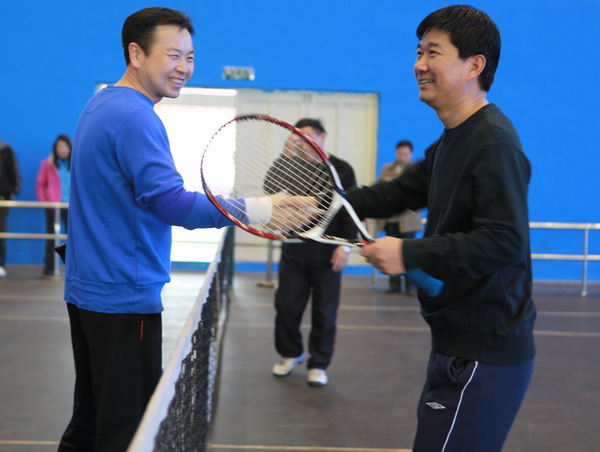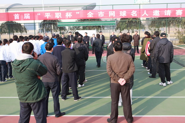 11月24日,首届“平职杯”网球名人邀请赛开战,本次活动由平顶山市网球协会、中国平煤神马集团网球协会主办,我院网球协会承办。参赛选手分别来自市政府、集团公司、体育局、平顶山卫东区等单位,各位选手都抱着极大的兴趣和热情参与到本次活动中。省辖市市长级干部、平顶山市政府党组副书记邢文杰;平顶山市副市长郑茂杰;中国平煤神马集团副总经理,平顶山天安煤业股份有限公司董事长、平煤国际矿业投资有限公司董事长刘银志;工会主席倪政新;平顶山市体育局局长宫新平;我院院长任文杰;平顶山市卫东区副区长黄东明;中国平煤神马集团工会办公室主任乔明翰;中国平煤神马集团文体办副主任倪建平;我院工会主席张立方等人参加了简短的开幕式。我院院长任文杰首先在开幕式上致欢迎辞;中国平煤神马集团党委常委、工会主席倪政新和平顶山市副市长郑茂杰先后讲了话。开幕式由中国平煤神马集团纪委副书记、监察处长张琦主持。