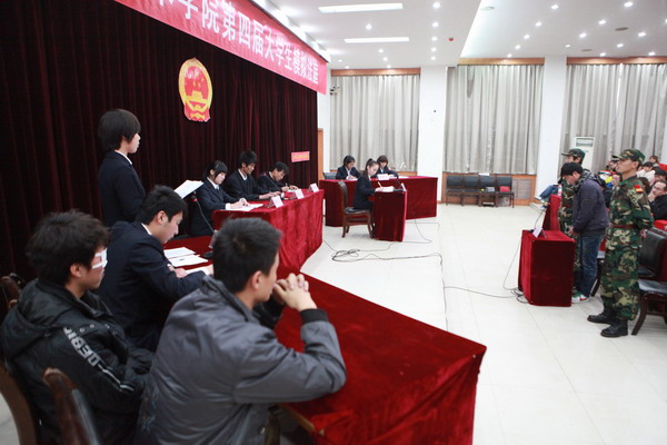 如果法庭不是在我院的报告厅里,如果不是法庭上的审判长、书记员、公诉人、法警和辩护人都显得是那么稚嫩,一定以为这是某法庭在正式开庭。即使这样,许多在现场旁听的学生也被近似真实的场景迷惑,被逼真的表演融入到其中,切切实实上了一堂生动逼真的法制教育课。“经典案例的生动再现,让我们切切实实明白了许多道理。”一个学生对记者说。在全国“12.4”第十一个普法宣传日到来之际,11月30日,我院思想政治教学部组织开展了第四届“大学生模拟法庭”,为500余名学生上了一堂生动的《思想道德修养与法律基础》大班课,丰富了教学形式和内容,推动了我院普法教育工作深入开展。