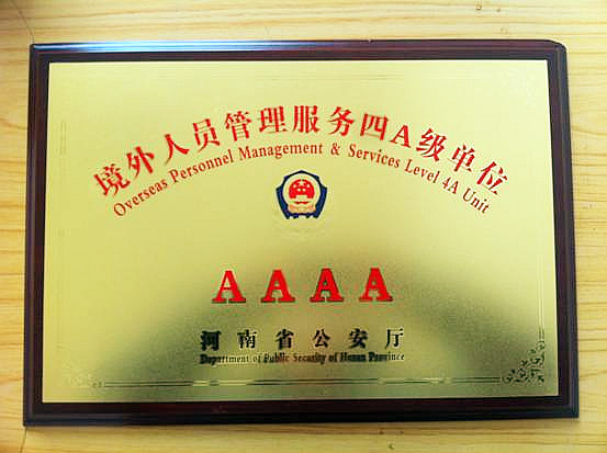 近日,我院被河南省公安厅授予“境外人员管理服务四A级单位”称号。