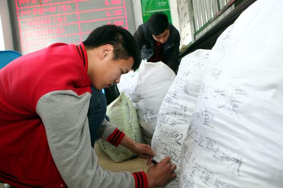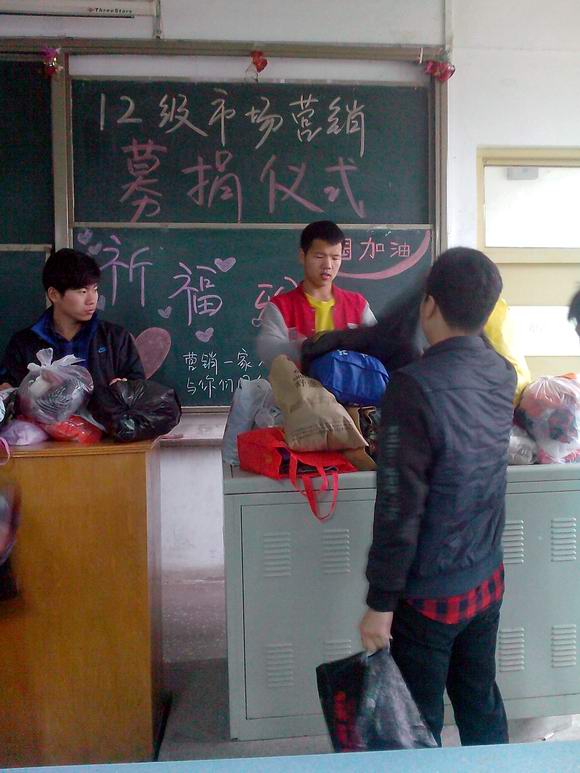 4月22日中午,经济管理学院2012级市场营销专业4个班的124名同学,自发组织捐助了自己的衣物和被褥等物品共500余件,通过邮政免费通道寄往四川省雅安市芦山县地震灾区。“雅安坚持!”“雅安加油”,很多同学还制作了祝福爱心卡片,随着衣物一起放在包裹里,把平职学子的祝福带往地震灾区。