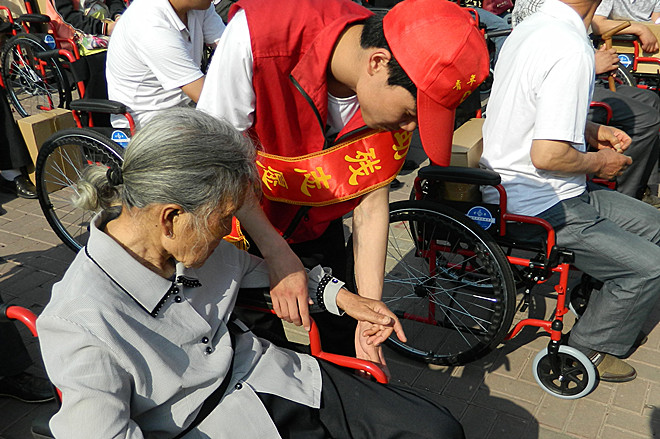 广场上随处可见一群群的“小红帽”陪伴在残疾人的身边。在轮椅捐赠活动启动仪式中,志愿者们帮助残疾人有序进场,陪同残疾人领取轮椅,并主动安装轮椅,给残疾人家属讲解轮椅的使用方法、注意事项等。