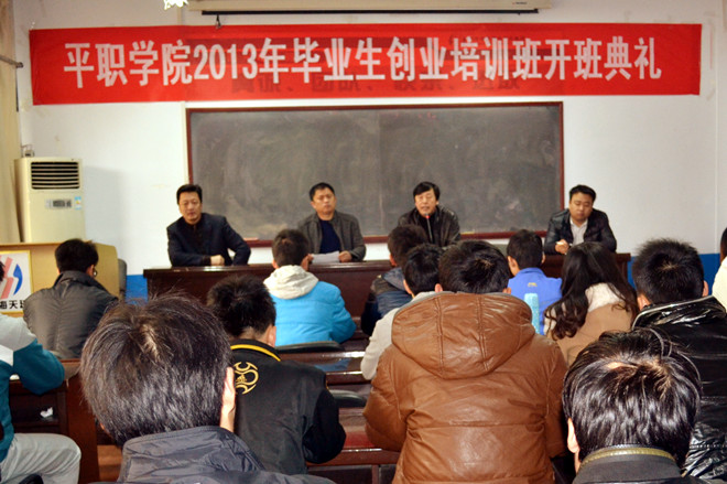 11月22日上午,由我院和平顶山市人力资源和社会保障局在就业处四楼共同举办了2013年毕业生创业培训开班仪式。平顶山市劳动就业培训部主任车向洲、省创业培训师张文胜、平职学院就业处处长龚建民等出席开班仪式并讲话,平职学院60名应届毕业生参加了首批培训。