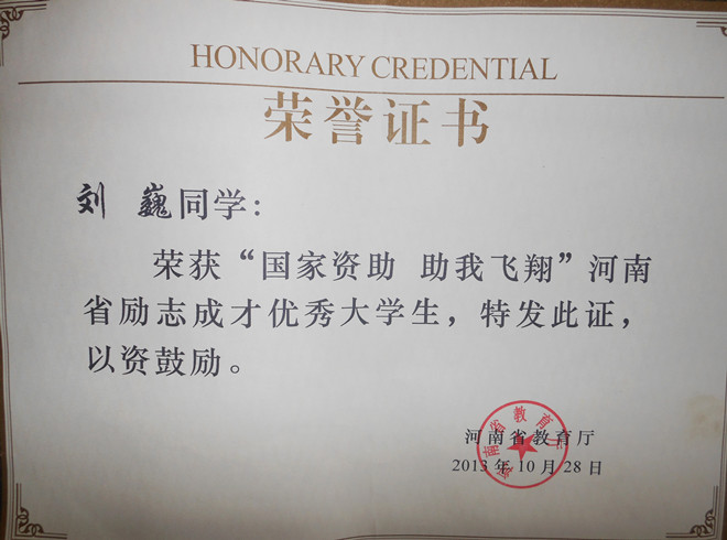 刘巍同学现在安阳工学院机械工程学院汽车服务工程专业二年级学习。当他得知得奖的消息时,他对母校的资助工作给予了很高的评价。他认为学校非常重视贫困生工作,不断加大资助力度,通过“绿色通道”、 “勤工助学”和“国家助学贷款”等资助项目,为贫困生学习铺平道路,解决了他们后顾之忧。今后他将更加努力学习,刻苦钻研,不断取得优异成绩,成为国家建设发展的栋梁之才。(李宜春)