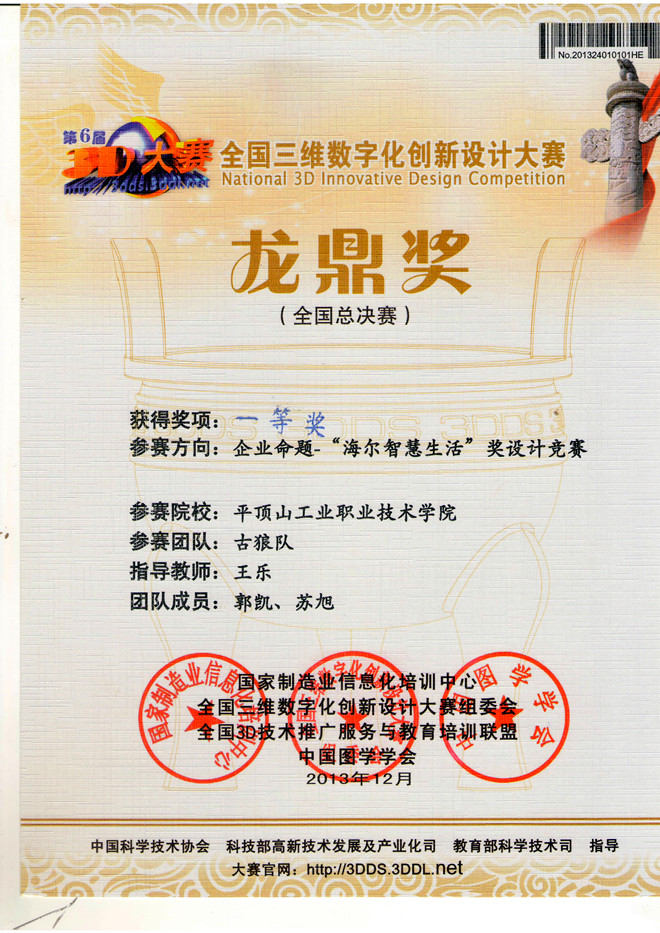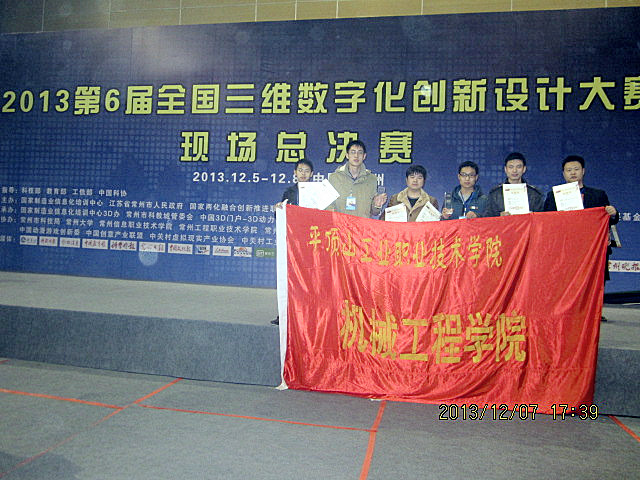 12月5日,2013全国江苏常州第六届全国三维数字化创新设计大赛总决赛(简称3D大赛)现场总决赛在龙城江苏常州隆重开幕。经过初赛、复赛层层选拔,我院机械设计与制造专业郭凯、苏旭两名学生组成的“古狼队”在企业命题“海尔智慧生活”设计竞赛中荣获全国一等奖。指导老师王乐。机械设计与制造专业3位学生张洪飞、谭俊杰、段园浩组成的“天蝎工作室”代表队在工业与工程设计大赛中荣获全国二等奖。指导老师王乐、刘东晓。