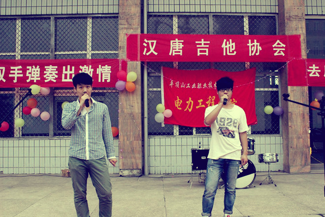 在这生机盎然,鸟语花香的季节,电力工程学院汉唐吉他协会在我院综合馆门前举办了一场以“用双手弹奏出激情”为主题的专场演唱会。