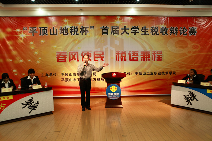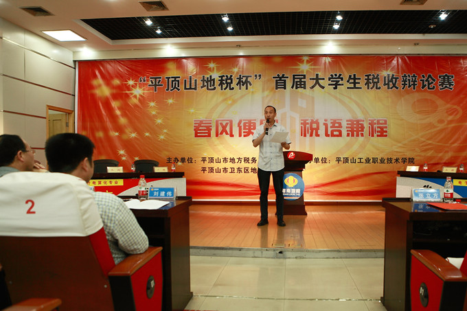 学院工会主席张立方致欢迎辞,他说,我院以税收宣传月系列活动为载体,结合专业特色开展第二课堂教育和社会实践活动,不仅加强了学科建设,繁荣了校园文化,更为学生开拓财经视野、展示自我才能提供了广阔的舞台,税收宣传月活动作为我院校园文化对外辐射的窗口之一,在提高我院对外影响力的同时,更推动了全院师生学税法、懂税法、守税法,形成了良好的税收法律意识,对于创造“税收经济文化”与“校园文化”有机融合有着十分积极的意义。这是我院贯彻落实“党的群众路线实践教育”活动,与平顶山市地税局进一步加强深化合作取得的“双赢”。他希望通过本次比赛,在全院再次掀起学习税法、宣传税法的热潮,营造良好的校园文化氛围。