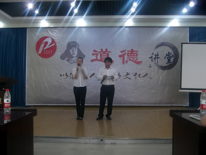 道德讲堂活动分为5个内容:“合唱一首歌、诵读一段经典、讲一个故事、作一个承诺、送一份祝福”。活动中学院书记李慧超代表学院全体教师做出四项承诺:一、做遵循社会公德的表率。二、做遵循职业道德的表率。三、做遵循家庭美满的表率。四、做遵循个人品德的表率。