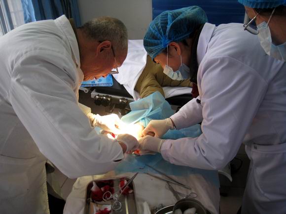 图为卫生所医护人员在为学生进行手外伤清创及游离皮瓣缝合术