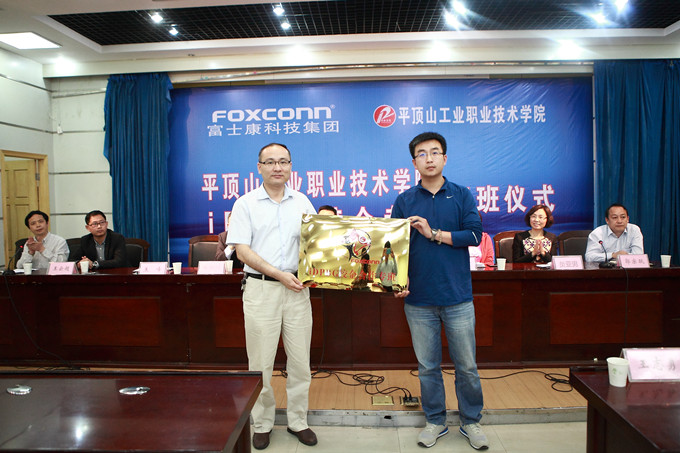开班仪式上,校企双方签订了办学协议。富士康科技集团郑州工业园学习与发展课专理冯云鹏为定向培养专班授“富士康IDPBG校企合作专班”牌。
