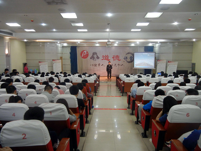 以“五个一”模式开展,讲述一个故事,诵读一段经典,品味一下人生,唱一首歌曲,发一条短信。本次道德讲堂首先以公益广告《别让等待成为遗憾》缓缓拉开帷幕,然后播放视频2014年感动中国人物之一的“大孝之女”朱晓辉,并朗诵了一段古文道德经典《弟子规》阐述古往今来,百善孝为先的经典传统美德。一首《父亲》,其高亢的歌声,满腔的热忱,唱出了我们的激情,唱出了我们的心声。最后以简单直白的爱的表达式《family》阐述对父母的浓浓爱意,现场同学纷纷拿出手机向父母发出短信,感谢父母的生育之情、养育之恩、教育之泽。