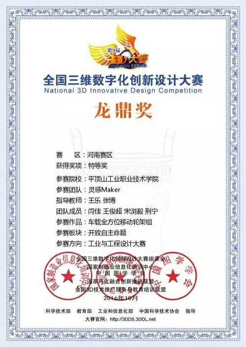 11月12日,记者从第九届全国三维数字化创新设计大赛(简称3D大赛)获悉,平顶山工业职业技术学院机械工程学院王乐、张博老师指导、由机械设计与制造专业4位学生闫佳、王俊超、荆宁、宋浏毅组成的“灵感Maker”参赛队的作品《车载全方位移动轮架组》荣获河南赛区特等奖并晋级全国总决赛。