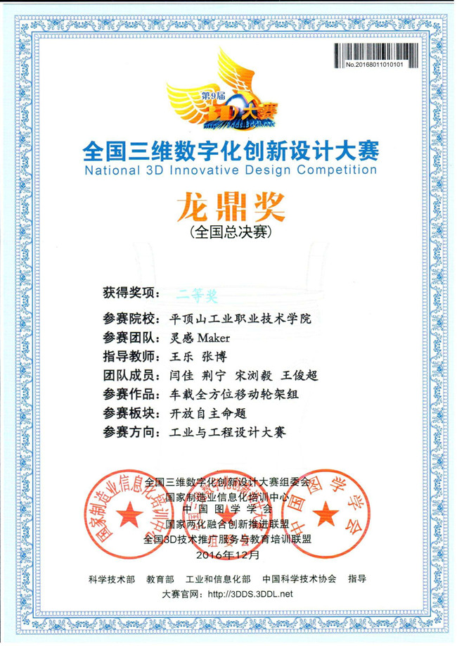 12月16日,记者从第九届全国三维数字化创新设计大赛(简称3D大赛)获悉,平顶山工业职业技术学院机械工程学院王乐、张博老师指导、由机械设计与制造专业4位学生闫佳、王俊超、荆宁、宋浏毅组成的“灵感Maker”参赛队的作品《车载全方位移动轮架组》荣获本届3D大赛全国总决赛二等奖。