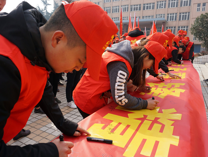 3月4日上午,在平顶山工业职业技术学院雕塑广场上,该院的大学生志愿者在一块印有“传承雷锋精神,争做时代先锋”的条幅上签名。当天,该校启动2017年度学雷锋志愿服务活动,600余名大学生志愿者纷纷签名,表示要进一步弘扬志愿服务理念和志愿服务精神,争做志愿服务先锋。(本报记者 彭程 摄)