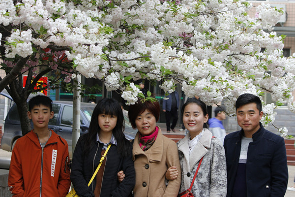 单招考生和家人在樱花树下留念