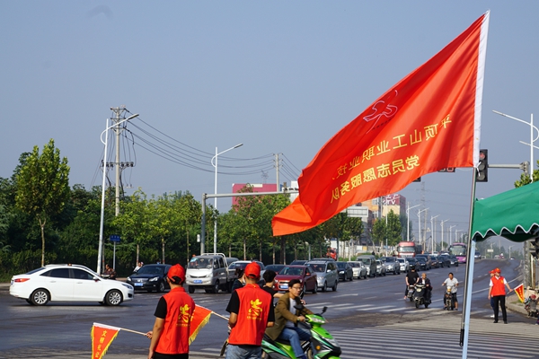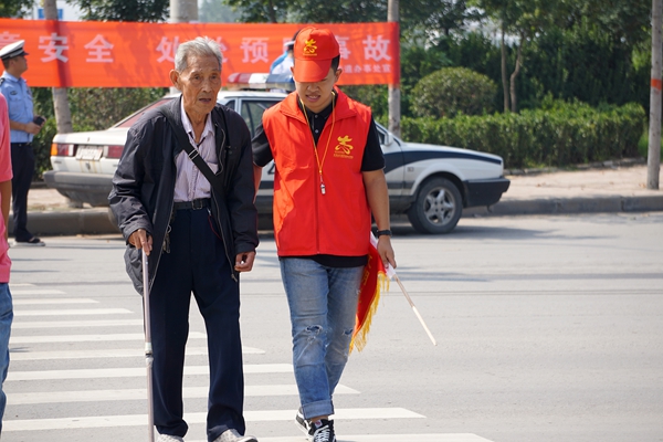 光明路与黄河路路口作为进出市区的一个主要交通路口,每天车流人流量大,我院参与志愿服务活动的志愿者们,身穿印有学院标志的红马甲和小红帽,每天7:30——18:30,全天无间歇在路口开展文明交通服务。虽已进入秋季,但这几天天气依然炎热,志愿者们顶着烈日,挥洒汗水,向来往的市民宣传交通法规,并举起“文明礼让”的旗子,按照交通规则协管斑马线,提醒过往市民注意交通信号,做到文明协管,微笑服务,文明出行。遇到年纪大的老人,志愿者们就上前主动搀扶着他们,在尽心的为每一位市民提供细致细心服务的同时,用实际行动彰显并弘扬着新时代的志愿服务精神。为营造充满爱心与谦让的交通环境,构建和谐、文明的城市环境作出了积极奉献。(魏宏伟)