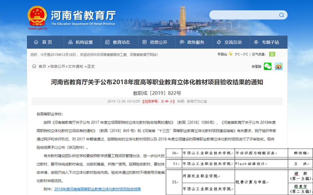近日,从教育厅发布的《河南省教育厅关于公布2018年度高等职业教育立体化教材验收结果的通知》中获悉,我校韩恒梅老师主持的《平法识图与钢筋实务》、王洪老师主持的《Flash动画设计》、顾慧芳老师主持(第二主编)的《税费计算与申报》等立体化教材顺利通过验收。