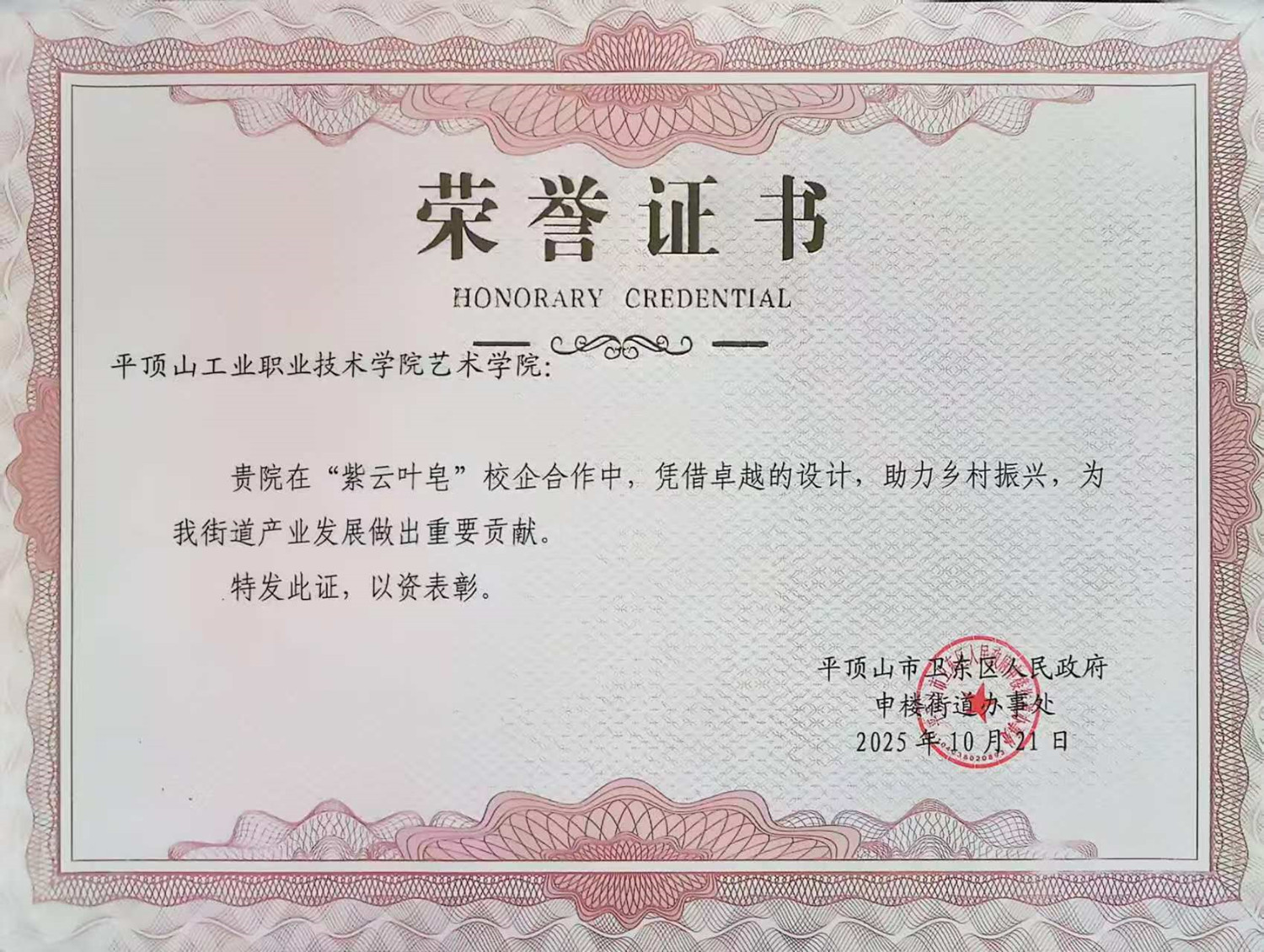 会上,艺术学院获颁由卫东区人民政府申楼街道办事处授予的荣誉证书。该项目一代产品已成功上市,凭借出色的设计赋能与产品实力,取得了良好的市场反响与经济效益,切实为乡村振兴作出了贡献。