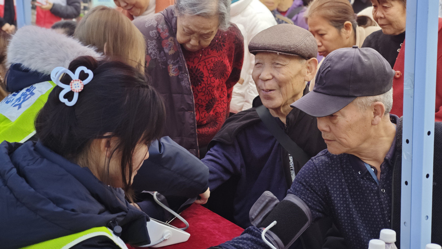 活动期间虽有小雨,但志愿服务点前秩序井然。身穿护士服、佩戴党徽的师生志愿者们坚守岗位,为前来咨询的市民提供专业服务。健康监测区内,志愿者为老人测量血压、血糖,并结合结果提供健康指导和日常建议,提醒他们关注身体状况,养成良好生活习惯;爱眼护眼区内,免费清洗眼镜和视力检测服务受到欢迎。志愿者在清洗、调试眼镜的同时,也向市民介绍科学用眼知识,服务细致专业,获得一致好评;急救知识普及区气氛热烈。志愿者利用模拟人偶,演示并讲解心肺复苏与海姆立克急救法的操作步骤及注意事项,语言通俗易懂,并邀请市民动手体验、现场指导。