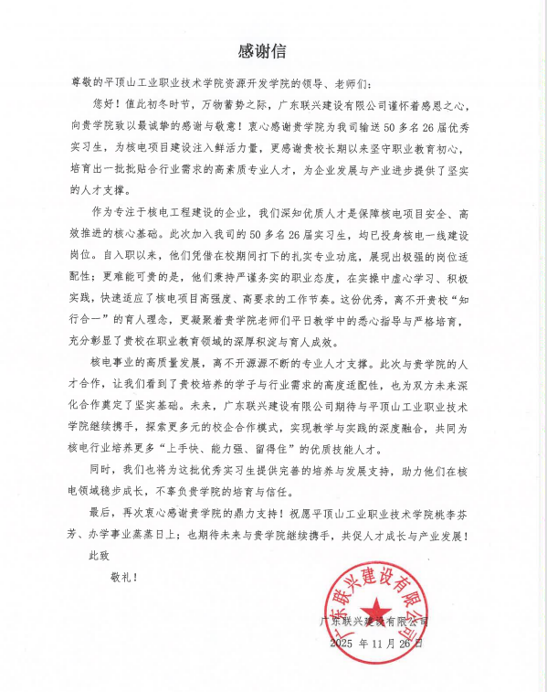 近日,资源开发学院收到广东联兴建设有限公司发来的感谢信。信中,企业对学院输送的50余名优秀实习生给予高度赞誉,对学院深耕职业教育的坚守与育人成效致以诚挚敬意,为校企合作再添温情注脚。