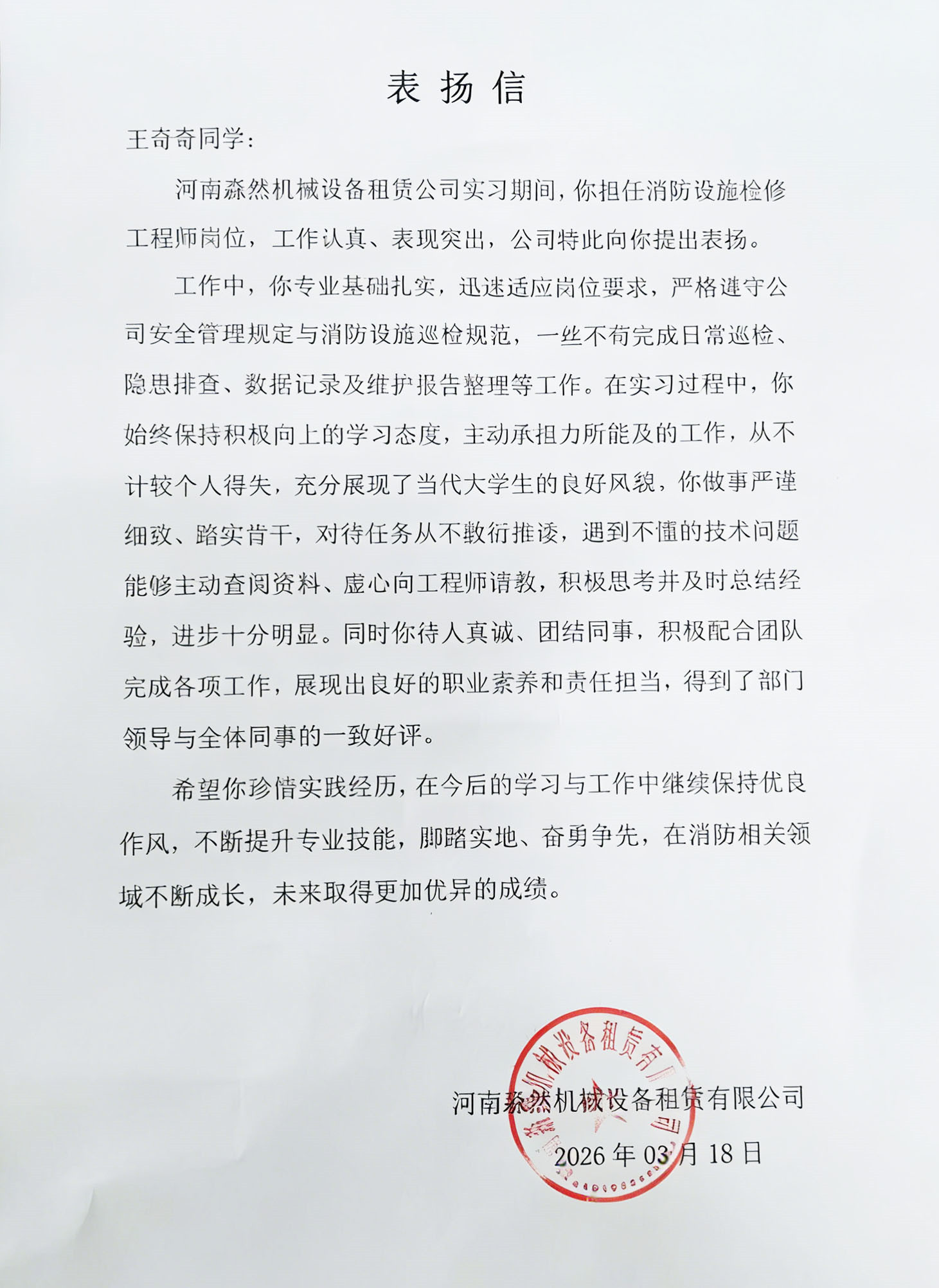 近日,资源开发学院收到了来自河南淼然机械设备租赁有限公司的表扬信,对应急救援技术专业首届应届毕业生王奇奇同学,在实习期间的优异表现给予了高度评价与充分肯定。