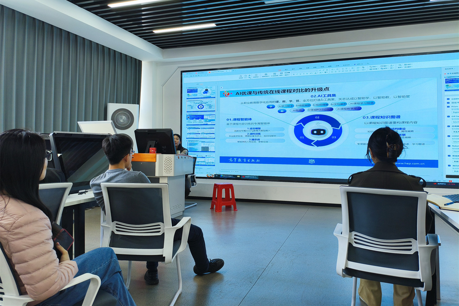 培训会上,裴毓岚系统介绍了智慧职教AI优课平台的核心架构与创新功能,重点围绕课程智能体、知识图谱、AI工具集三大核心模块进行深度剖析。她通过理论讲解与实操演示相结合的方式,详细展示了平台如何实现AI智能备课、一键生成课件、智能组卷出题、自动批改作业、个性化学习路径推荐、虚拟助教答疑等全流程智能化教学应用,不仅让全体教师系统掌握了智慧职教AI优课平台的建设方法与应用技巧,更有效拓宽了教学创新思路,为学院加快课程数字化、智能化升级奠定了坚实基础。