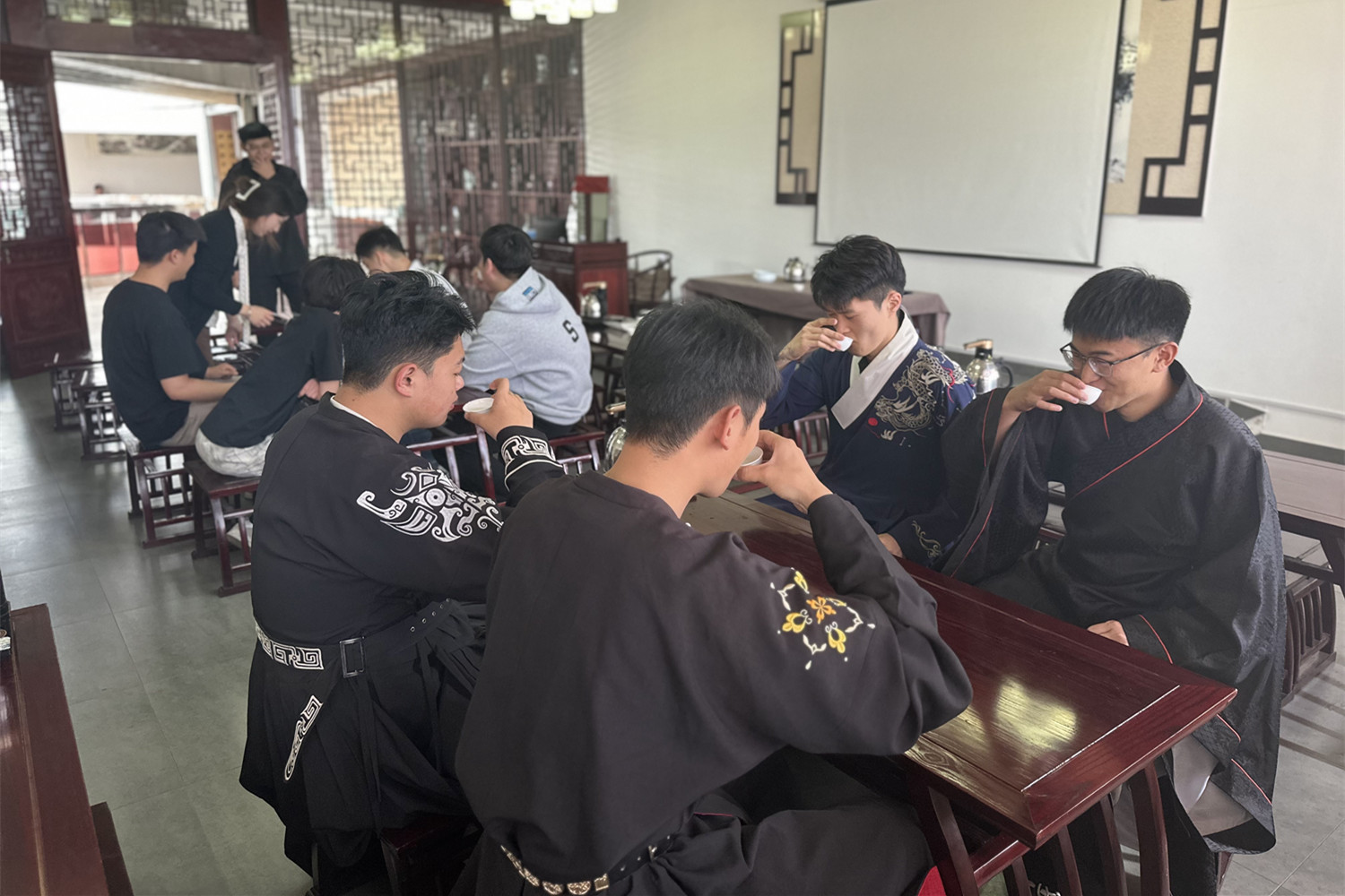 活动中,同学们参与了品茶、书法、古装、射箭等一系列传承文化体验活动。在古风体验区,同学们纷纷换上传统服饰,亲身领略中华古韵与古人别样的风采;在品茶鉴赏区,大家围坐交流,于交谈中体悟茶文化的深厚底蕴;在书法体验区,同学们挥毫泼墨,沉浸在笔墨书香与传统文化的氛围之中。