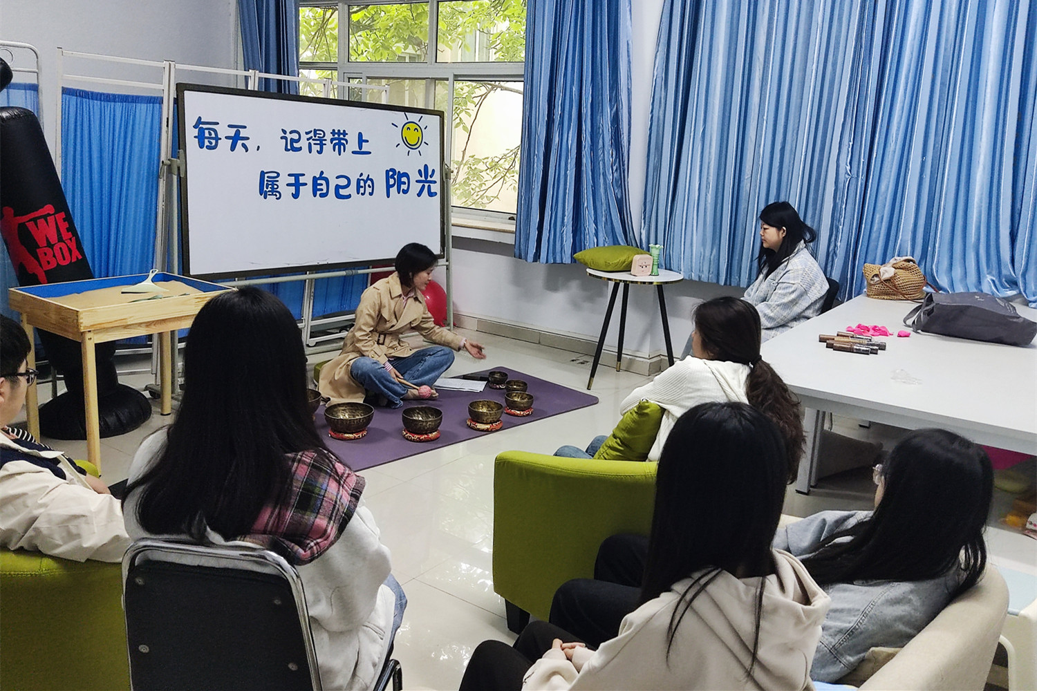 近日,护理学院在医学实训楼心理咨询室举办颂钵助眠体验活动。活动特邀心理老师专业指导,现场氛围安静温馨。