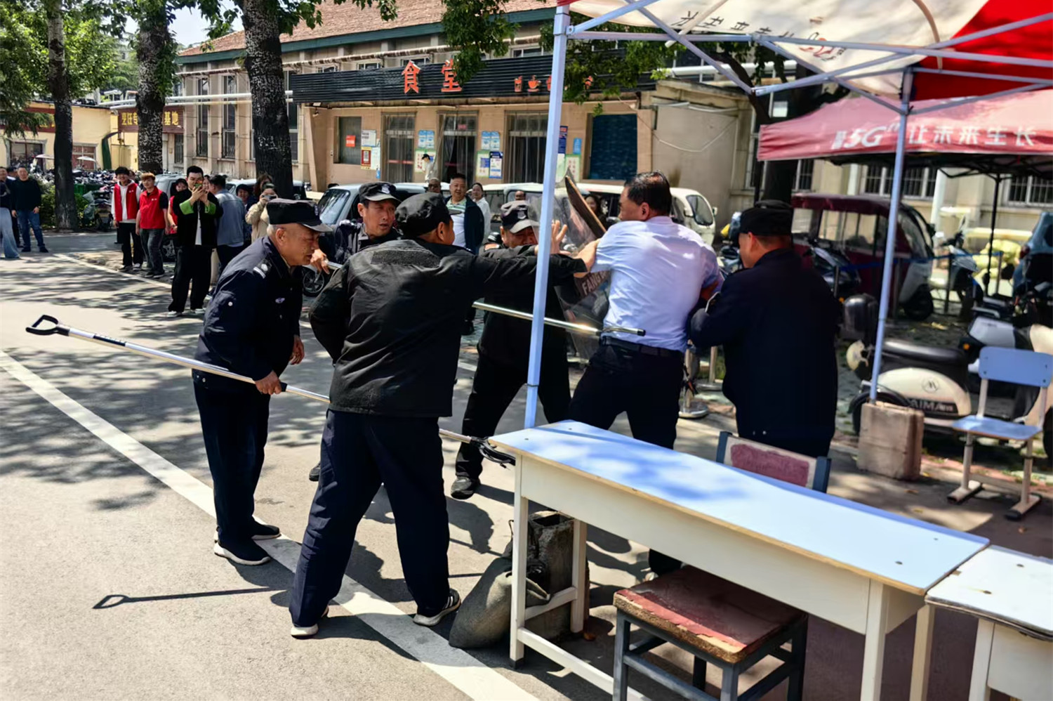 演练环节中,武装保卫部门相关负责同志首先带领大家系统学习了预防校园爆炸恐怖事件的识别要点、应对策略及处置流程,为实战演练筑牢理论基础。随后,武装保卫人员模拟暴恐分子持刀具、携带爆炸物品突然闯入校园的场景,按照规范流程开展应急处置演练,完整展示了从预警响应、现场控制到人员疏散、后续处置的全流程操作,进一步提升了安保人员和师生应对突发事件的实战能力。